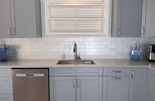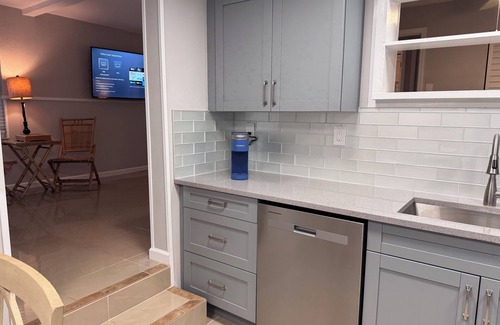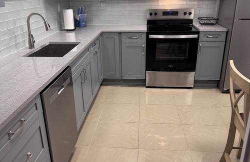 The Bungalow offers a spacious eat-in kitchen with new appliances/all wood soft closing wooden cabinets and Quartz countertops + fully stocked kitchen!