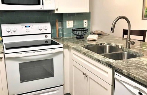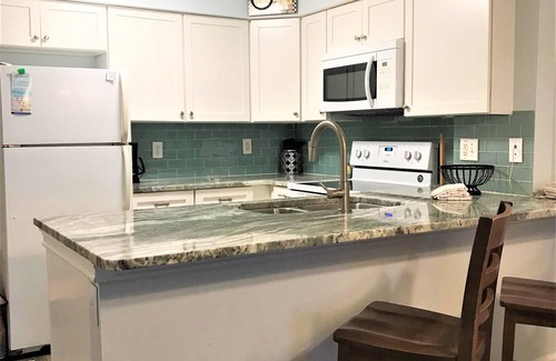 A Full Kitchen makes preparing meals easy! It has full a washer and dryer. Very comfortable balcony high top table and chairs! You are only steps away from the beach!