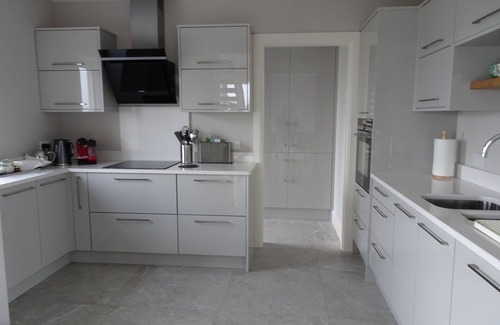 Perfect for a large group of people, this wheelchair friendly house features 6 luxurious bedrooms and 5 full bathrooms accommodating up to 12 people comfortably. Upon entering the premises, there is a spacious kitchen diner and 2 separate living room spaces, one on the ground floor and one on a mezzanine level both with exquisite views of Galway Bay. The kitchen is fully equipped with all modern appliances. There is also a separate utility room containing a washer and dryer as well as plenty of storage space.