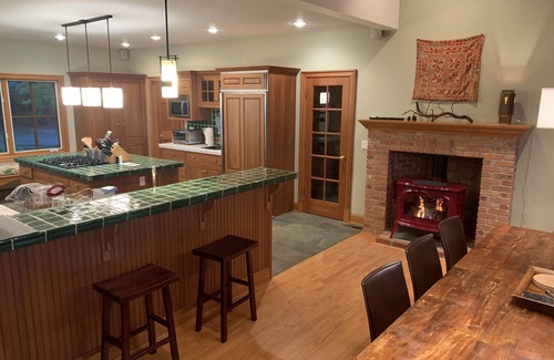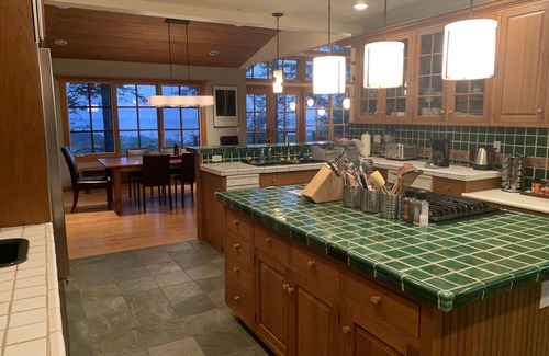 Accommodations: 5 bedrooms, 3.5 bathrooms, living room, dining room, gourmet kitchen, media room (lite), playrooms/yoga room, sauna, hot tub, decks with views, lots of closets, workshop, garages, outbuildings… (Comfortably sleeps 10, can sleep up to 12.)