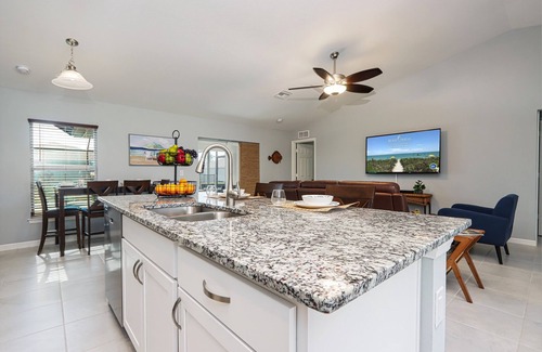 Looking for a fabulous new rental home? Then look no further than Sun & Fun! You can be one of the first to experience this stunning pool home! With its modern design and open floor plan, it's perfect for entertaining. The tall cathedral ceilings add to the grandeur of the space, and the large screened lanai is the ultimate spot for hosting guests or simply enjoying a warm evening breeze.