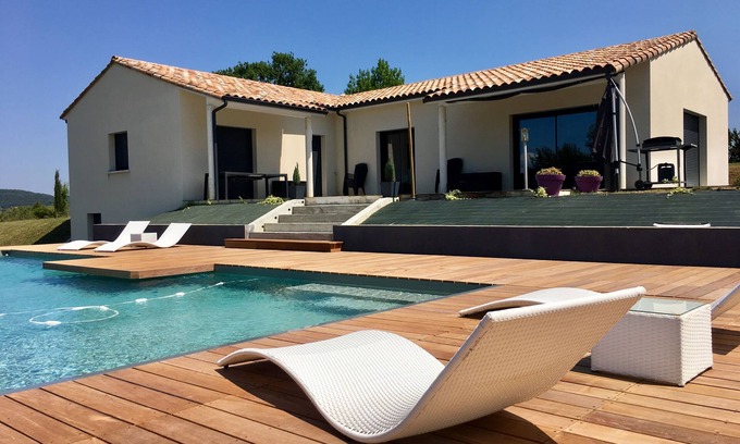 At the heart of the Périgord Noir, in the golden triangle near Sarlat and close to the Dordogne River with beach and swimming, this beautiful new house in contemporary style has a perfect location. On a private plot of 1 hectare Spacious and bright, large windows offers an exceptional view of the wooded hills and surrounding meadows.