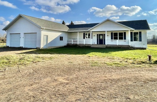 Looking for a vacation rental where you will feel right at home? Then this is the place for you! This modern & spacious single-level country home is great for a single person, you and your spouse, family, group of friends, or hunting group! Built in 2017, this 3 bedroom, 2 bath home offers an open floor plan, a comfortable stay all on one floor, large rooms, central air, and views of our privately owned woods and frequent wildlife in our fields. The kitchen is all set with a refrigerator, stove/oven, microwave, dishwasher, pots & pans, dinnerware/utensils and coffee maker, has an island, and breakfast bar seating. The living room features a beautiful gas fireplace and adjoins the dining area with dining table. The master bedroom is private on one end of the home and includes one full bed and one queen bed, walk-in closet and master bath with double sinks, standup shower, and whirlpool tub. The second bedroom has one queen bed and one full bed, the third bedroom has one queen bed, and the guest bath with shower & tub is located next to these bedrooms. Fresh linens and towels are always provided. There is plenty of space in the kitchen, living & dining room for activities, a large yard for outdoor activities, and large loop driveway offering free private parking and ample space for your trucks and/or trailers.