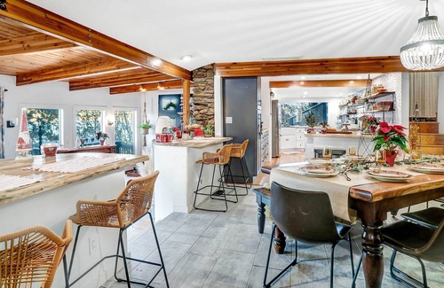 HOME FEATURES: Private hot tub, Smart TV, wood-burning fireplace, farmhouse dining table, board games, wood-burning fire pit w/ Adirondack chairs,