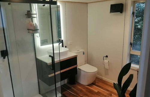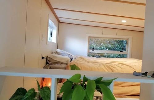 Relax and unwind, even bring your dog to this peaceful modern two loft tiny home on a fenced property a short walk from the lake.