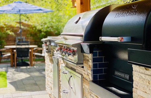 Prepare your gourmet meal on the top of the line outdoor grilling area, including a Traeger smoker. Or, just lounge and relax in a beautiful yard with bamboo growing all around.