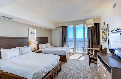 Your room includes a stunning ocean sunrise, a full kitchen or kitchenette, along with plush bedding and linens, and upscale bathrooms. Boasting an oceanfront setting, this beautiful two-bedroom suite features a queen bed and two double beds, luxurious bedding and a private oceanfront balcony. Additional amenities include two private baths with jetted tubs, a fully equipped kitchen, stainless steel appliances, and a separate living room with a queen sofa sleeper and three 42” HD flat screen TVs and Blu-Ray DVD player. Come stay at one of the top resorts in Virginia Beach.