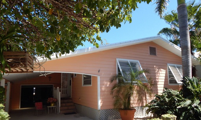 This one of a kind quaint cottage has built in 1973 and completely remodeled in 2011. The style is Craftsman. The size is 1,100 sq ft with Two Bedrooms, Two full baths and pull out queen size bed so sleeps 6. Cottage has 60' canal front with diving board,screen porch and new boat lift. There is a two car garage for trailer parking and a car port. There are indoor and outdoor waterfront porches and many topical gardens with mature palm trees, banana trees, 20' bamboo shoots, Orchids, Bougainvillea plants etc.