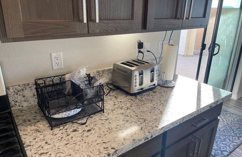 Awesome Desert Escape. Sits on 1/3 Acre, with sweeping mountain views and incredible sunsets. Enjoy the very large pool , heated spa, waterslide, water features and backyard entertainment space including large, long countertop, gas grill and firepit for cool nights. The 11' deep pool stays refreshing all year long. The water slide coupled with the large Baja shelf and heated 10 person SPA make this a water lovers paradise. The Kids will wear themselves out going down the slide, then wrap up a long day making S'mores over the fire. Over 1500 sq. ft. of outdoor covered patio has great summer shade and a large 65" TV to catch the game or watch a movie while relaxing on the large out door couch or even sitting in the spa. The kids love the "Dive In Movie" watching movies from the spa. You'll enjoy a very comfortable Interior space with a ton of board games, poker chips, cornhole, TV options and other fun stuff to make for lots of great memories. We like to cook, the kitchen is very well appointed with all the utensils and tools you'll need to keep everyone fed and happy.....whether its making a margarita or toasting marshmallows over the fire we've got it covered. Well behaved kids and pets are welcome, this is our family's home and we want your friends and family to enjoy it as much as we do.