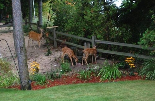 There is a gourmet kitchen, beautiful original stone fireplace that is used year round, and the grounds are spectacular. Large front (Lakeside) patio is perfect for a late evening bbque and sunset. The back (street side) patio is perfect for coffee while the sun comes up. There are hiking trails within walking distance. Great biking routes and you can even bike into town. Currently, because of the high water levels, we have sandy cove instead of endless walkable beachand we have a massive seawall which has a very large sandy area with a firepit and seating. This is a private seawall for our property. There is easy accessibility to our private beach cove. And there are large beaches at both of the public beaches in town with playgrounds. This is the perfect getaway for a family.
