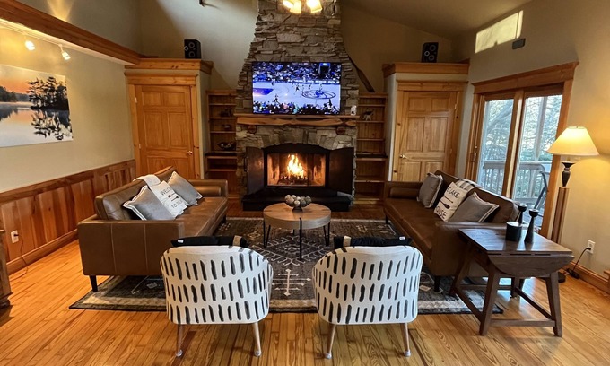 New Listing -Beautiful 4-bedroom 2-bathroom lakefront home. Swinging Bridge is a 9 mile motorboat lake a real natural oasis away from city life but still with everything close by. You can jump, swim, fish or boat right from our private dock. Kayaks and standup paddle boards with life jackets provided. Outdoors there is a beautiful fireplace, hot tub, and outdoor shower with hot water! Indoors is a wood burning fire place beautiful open kitchen and fun game room. Very spacious inside and out! Everything is brand new! Listing will be ready in May more pictures as they are ready!