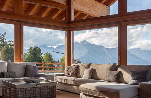 "Chalet Aquarius", 6-room chalet 245 m2 on 3 levels. Modern and tasteful furnishings: large living/dining room 85 m2 with panoramic window with Scandinavian wood stove, cable TV, CD-player and DVD. Open kitchen (oven, dishwasher, 5 induction hot plates, toaster, kettle, microwave, electric coffee machine, Capsules for coffee machine (Nespresso) extra, raclette grill, fondue Set (cheese)). Sep. WC. Heating. On the lower ground floor: 1 room with 2 beds (90 cm, length 200 cm), shower/WC. 2 rooms, each room with 2 beds (90 cm, length 200 cm). Bath/shower, sep. WC, Sauna. Upper floor: 1 room with 1 double bed (2 x 90 cm, length 200 cm), shower/WC. 1 room with 1 double bed (2 x 90 cm, length 200 cm), shower/WC. 4 balconies, north-east facing position and north-west facing position, terrace, west facing position. Terrace furniture, barbecue, deck chairs (4). Panoramic view of the mountains, the valley and the resort. Facilities: washing machine, dryer, children's high chair, baby cot, hair dryer. Internet (WiFi, free). Reserved parking (2 cars), garage (2 cars), height 200 cm, width 245 cm. Please note: non-smokers only.