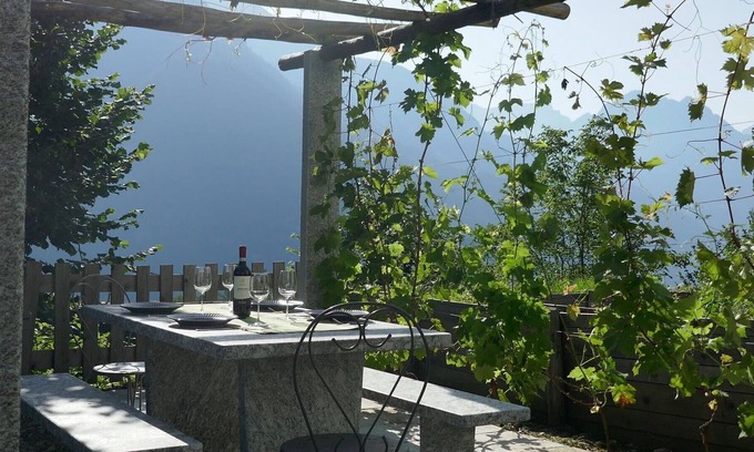"Casa Lisca", 3-room house on 2 levels. Partly with sloping ceilings, simple and rustic furnishings: open living/dining room with open-hearth fireplace, dining table and satellite TV. Open kitchen (4 hot plates, oven, dishwasher, toaster, kettle, freezer, electric coffee machine, raclette grill, fondue Set (chinoise, cheese)) with small bar. Upper floor: (spiral staircase), 1 double bedroom with 1 double bed (1 x 160 cm, length 200 cm). 1 room with 2 beds (90 cm, length 200 cm). Bath/WC. Electric heating. Garden. Terrace furniture, barbecue (portable). Beautiful view of the mountains and the countryside. Facilities: washing machine, children's high chair, baby cot for up to 2 year olds (extra), hair dryer. Internet (WiFi, free). Please note: non-smoking house. 1 pet/ dog allowed. NL-00002112