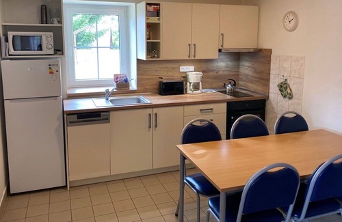 4-room house 100 m2 on 2 levels. Bright, comfortable and cosy furnishings: open living room with satellite TV. Exit to the terrace. Kitchen (oven, dishwasher, 4 induction hot plates, toaster, kettle, microwave, freezer) with dining table. Sep. WC. Upper floor: 2 rooms, each room with 2 beds. 1 room with 2 beds and 1 folding bed (length 180 cm). Bath/WC. Small terrace. Terrace furniture, barbecue. Facilities: washing machine, baby cot. Internet (WiFi, free). Please note: suitable for families. Non-smoking house. 2 pets/ dogs allowed.
