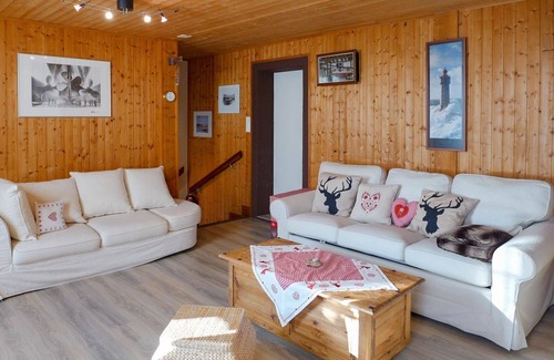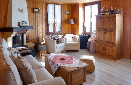 "Chalet Tsi-No", 5-room chalet 105 m2 on 3 levels. Practical and comfortable furnishings: lounge with open-hearth fireplace and TV (flat screen), radio and DVD. Exit to the balcony, south facing position. Office. 1 room with 2 pull-out beds (2 pers. 2 x 90 cm). 1 room with 1 french bed (1 x 140 cm). Shower/WC. On the lower ground floor: large kitchen (oven, dishwasher, 4 ceramic glass hob hotplates, microwave, electric coffee machine, Capsules for coffee machine (Nespresso) extra, raclette grill, fondue Set (cheese)) with bar, dining table. Sep. WC. Upper floor: (steep stair), 1 room with sloping ceilings, ceiling height 120 - 140 cm, without wardrobe with 1 french bed (1 x 160 cm). Small balcony, south facing position, small garden, west facing position. Terrace furniture, barbecue. Very beautiful panoramic view of the mountains. Facilities: washing machine, dryer. Internet (WiFi, free). Reserved parking (2 cars). Please note: non-smoking house. 1 pet/ dog allowed.