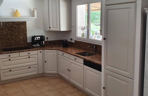 • Kitchen open to the living room (12m², fully equipped: high and low furniture, pink granite worktop, sink, dishwasher, induction hob, extractor hood, multifunction oven, microwave oven, fridge, electric kettle, blender, electric coffee makers - percolator and Nespresso - toaster, cookware, dishes - 2x12, cutlery, etc.)