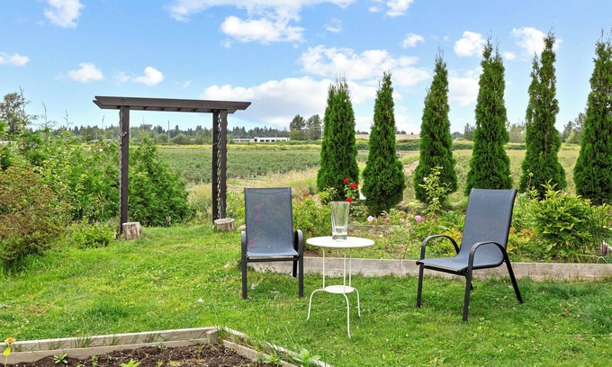 The suite including a living room, bedroom, bathroom, and full kitchen. A view of Mount Baker, and surrounded by blueberry fields.