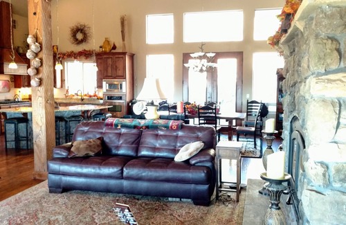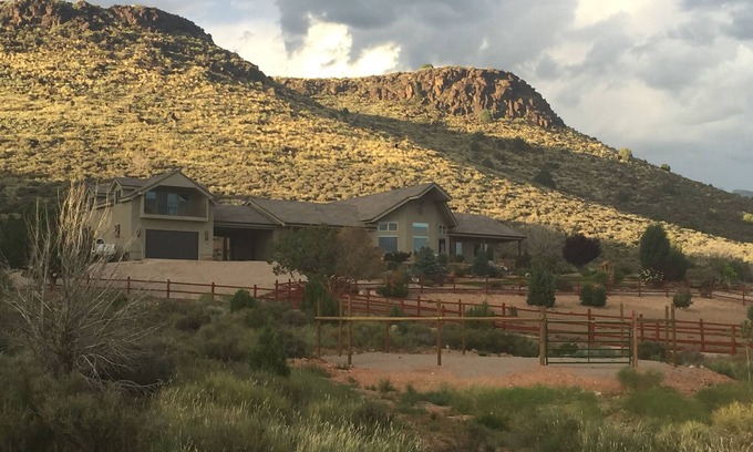 Beautiful quiet ranch retreat. Large great room with wood beam ceiling, mountain lodge atmosphere with wood burning fireplace. Secluded on 5 acres with beautiful view of valley and horse area. Full RV hookups. Hot tub, fireplace also in bedroom, upstairs casita with extra cots, sleeping pads, bunk beds, 2 port-a-cribs, toys and games, and deck with view. Incredible hiking, scenic canyons, minutes from beautiful Snow Canyon. 15 min from St. George restaurants, shopping, golf courses, Tuacahn outdoor Amphitheatre. Access to Las Vegas, Zion, Bryce, Lake Powell, or Brian's head skiing. Available for St. George Marathon, Triathlon, Senior Games, Iron Man, Dixie Roundup rodeo, all other events. Great access to marathon course. Sleeps 12 in beds + 2 port a cribs. We have extra sleeping pads/cots. Can accommodate your horses if prior arrangements are made. Casita above garage may also be rented separately. (sleeps 6 + extra cots/ pads) We do have a 2 night minimum (some exceptions)