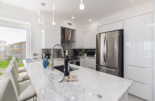 The gourmet kitchen is absolutely beautiful... there is a range, toaster, microwave, full size refrigerator, dishwasher, Keurig and more.