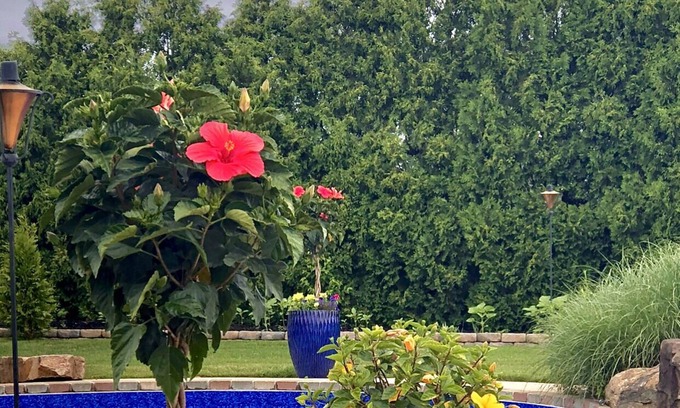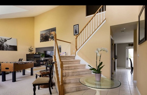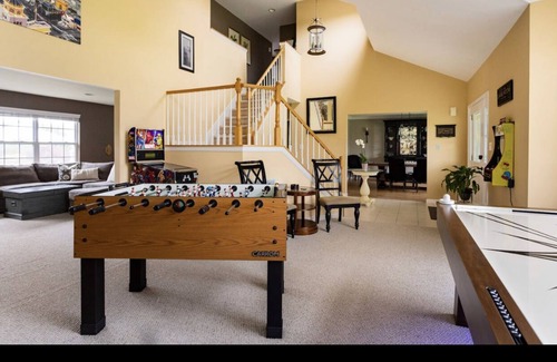 We are located on an acre in a quiet neighborhood. Sleeps up to 14 people with four bedrooms and a fully finished basement that sleeps 6. Perfect spot for the kids and adults to hang out, play ping-pong, watch movies, enjoy the ultimate game room or workout in the gym. But lets not forget about the beautiful, private outside area with a gorgeous, resort like pool with plenty area to lounge, sit and relax. Also offering a fire pit and hammock.