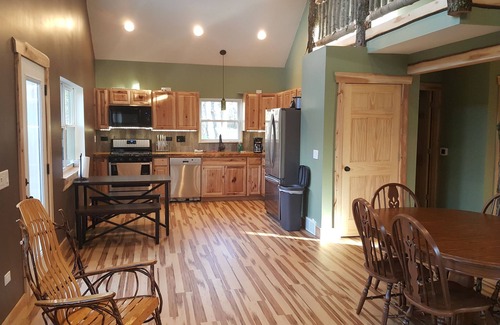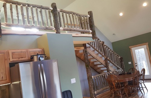 Welcome to our beautiful piece of the Northwoods! Come stay at this brand new, built in 2017 cabin on a 6 acre wooded lot located on a private drive. This 2300 square foot home features 4 bedrooms, two bathroom, family room, and a huge loft to accommodate up to 14 adults. The Master Bedroom features a king size bed, while the bedrooms 2, 3 and 4 have a queen beds. Moving up to the loft, you find 3 more queen beds for your comfort. The kitchen has stainless steel appliances (fridge, stove, microwave AND a dishwasher), plenty of counter space for all the necessities of your cooking, with lots of room at the dining table to eat, entertain, play board games, dice, or cards.