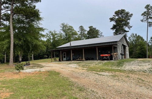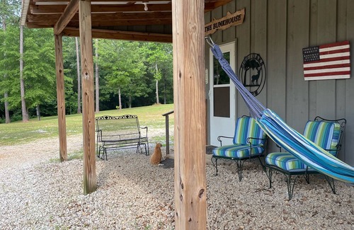 The Bunkhouse at Pine Oaks Farm in Coker, AL, just outside Tuscaloosa, is a perfect weekend getaway (football at Bryant Denny, graduation from the University, or just a relaxing country escape). The 800 square foot Bunkhouse features one huge bedroom with 4 beds, a spacious bathroom and a large great room and kitchen. Built in 2014, the Bunkhouse sits on a gorgeous 280 acre pine and oak tree farm. There is a large graveled parking area and an expansive grassy area for running and playing. Enjoy relaxing on the huge front porch watching for birds, turkey, and deer or take a siesta in the hammock. Sit around the fire pit roasting marshmallows or just star gazing. Perhaps you would prefer cooking up a delicious steak or burger on the Weber charcoal grill or in the fully stocked kitchen.