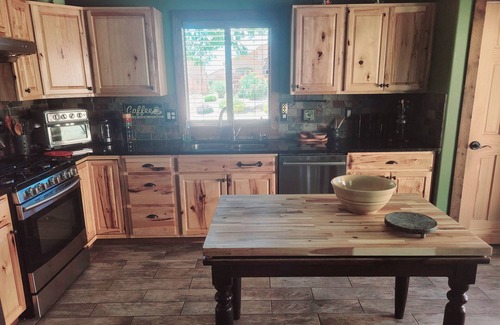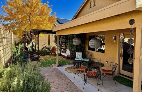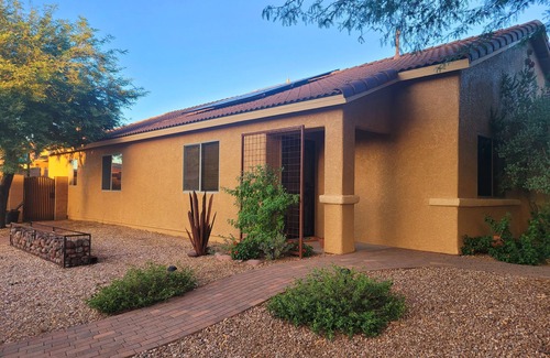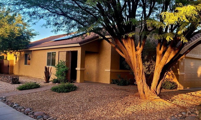 This unique home has a warmth and hominess that goes with all the richness and color of the southwest. Located at the base of the Santa Rita Mountains is a peaceful little Tucson suburb with a laid-back vibe. The elevation is slightly higher down here where most winters we get a quaint amount of snow. Here, you are located central to places you may want to explore while visiting Tucson’s beautiful Southwest region! Our beautiful desert is incredibly diverse with an abundance of plant and animal life. A hikers dream, with hundreds of scenic hiking trails! Saguaro National Park East is only 18 miles north with some of Tucson’s best! Or, take a scenic drive through the rolling hills south to Sonoita’s wineries, only a 40 minute drive from our home. Nearby Sonoita, is Patagonia Lake, which is also a popular destination. Not only for enjoying year-round fishing, but hosts one of Arizonas best locations for bird watching! Take a day trip down to historic Tombstone where the infamous O.K. Corral shootout in 1881 took place! And from there, a short 20min drive will bring you to the historic mining town of Bisbee. A great spot for walking through the towns streets for shopping and dining. About our home: Our home is in a safe tightnit neighborhood with plenty of parking. Security cameras are located at the front entrance of the house and at the side gate entrance to the backyard. Our spacious kitchen has all the amenities you need for cooking and dining in. The private outdoor living space is lively quaint, nicely shaded, and great for enjoying time outside. Equipped with a dining table for four, gas grill, nicely appointed deck for lounging, and a lovely landscaped yard. The large master suite has a king size bed, walk-in closet with a full size dresser, flatscreen TV, and private bath with walk-in shower. The guest bedroom has a queen size bed with a designated work space and flatscreen TV. The guest bath is just down the hall and is equipped with a shower and bathtub. Adjacent to the laundry room you’ll have access to our garage which has been converted to a gym! It’s an additional fun space with a shuffle board, couch, and flatscreen TV as well. And the living room area welcomes you right in with its lovely charm and eclectic character. There’s plenty of comfortable seating and is great for movie night or reading a book from our library. Come visit our private home that has a warmth and calming energy I'm sure you’ll love!