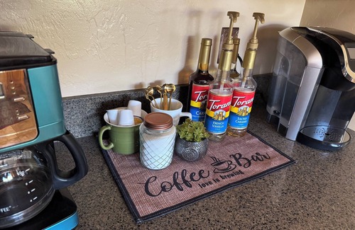 The kitchen is fully stocked with all of the essentials and more, including Keurig coffee maker, drip coffee machine, coffee bean grinder, french press, kettle, Ninja blender, toaster, large fridge freezer and stove. Essentials such as salt, pepper, cooking oil, some herbs and spices and coffee, trash bags and zip lock bags are available for your use. There are plenty of plates, bowls, glasses, cups and flatware, and a set of plastic dining plates, bowls, cups and flatware for children. The house is very well appointed for Holidays and entertaining.