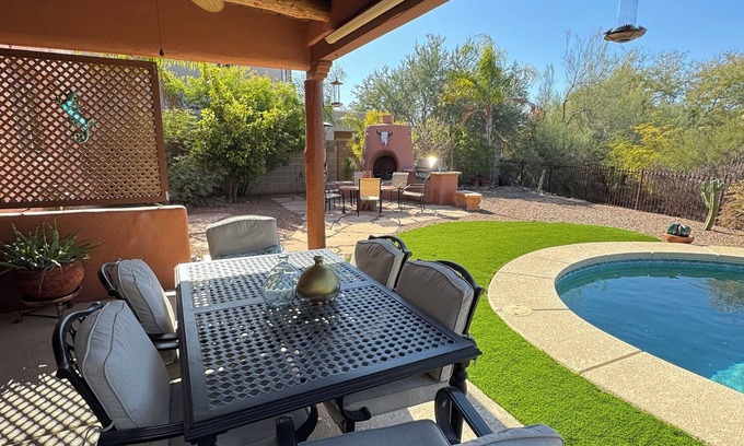 The pool and hot tub are well maintained and serviced weekly. The hot tub has an "easy lift" for the cover, making it easy to pull back the cover and jump in for some R&R time! There is no additional fee to use the hot tub and it is heated and ready to use year round! There is a 20 year old lemon tree that produces lots of fruit in the fall. The backyard is really well stocked with mature plants, which makes it feel very green, serene and secluded. The yard backs up to a wash where you'll see lots of wildlife, including quail, rabbits, squirrels, Javelinas, Coyotes, Bob Cats, Harris and Coopers Hawks, and occasionally a giant owl! (Please note the hot tub is currently out of service until Mid-september 2024)