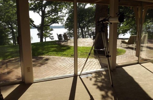 The Great Room in the Main House features two sitting areas, a fireplace, the dining table, a flat screen television, and a wall of windows/sliding glass doors that allow a spectacular view of the lake, and exit to the unique brick patio on one side.