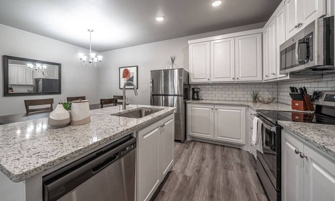 Step inside this new construction duplex home to find an open concept living room kitchen and dining area. The living room features a 65-inch Android enabled smart TV, a huge comfortable sectional, and a modern decorative touch so that you can enjoy a great stay here.