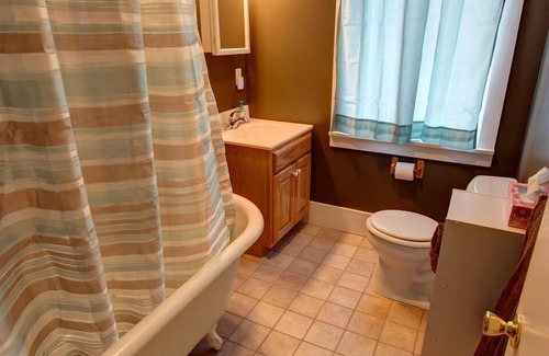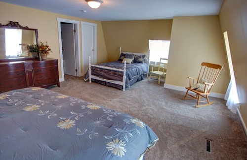 Upstairs is a large master bedroom with a king sized bed as well as a full sized bed and a full bath (and a crib). There are 3 bedrooms with queen sized beds. And one bedroom with 2 twin beds. Downstairs is the smaller bedroom/game room with a full sized futon (with TV). There is also a full bath with clawfoot tub.