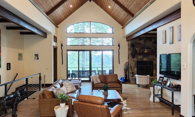 Love cooking? Love personal privacy? Love sitting by a fireplace looking into the mountains? This is the home for you! Double kitchen islands with prep area and sink with double ovens, 5 bedroom suites with their own bathrooms. Indoor and outdoor fireplaces to be cozy under wood beams and vaulted ceilings or sitting on a 60 foot deck infront of an outdoor fireplace looking out for miles. 15 minutes to fine dining, trails and 30 minutes to the ski resort.