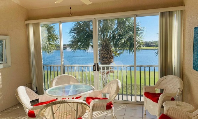 Come and enjoy our fully equipped luxury condo in beautiful Bonita Springs in southwest Florida! This second story unit with 14 ft vaulted ceilings, 2 bedrooms/bathrooms and all the modern amenities you'll ever need for your next fun filled, relaxing get-away. Enjoy the stunning lake and golf course views from the large master bedroom or the full panoramic view from the spacious living area that features 12 ft sliders that open completely onto your private lanai.