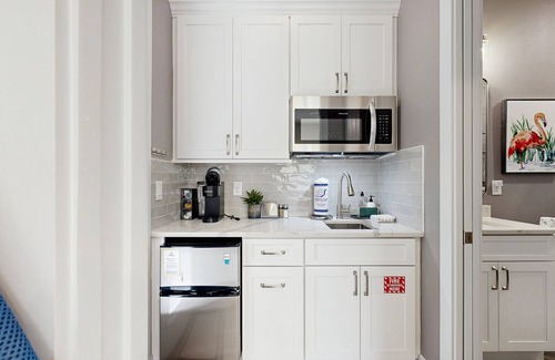 A kitchenette is provided in the hallway of the main suite, with a microwave, mini-fridge, and coffee maker. A large TV, a dedicated workspace, and a lovely en suite bathroom with an oversized walk-in shower await, while a comfortable bed in a spacious bedroom ensures that you'll get the best sleep of your life.