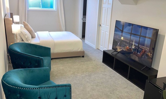 This relaxing beautiful basement is perfect for 2 people. It has a cozy queen size bed, flat screen TV, wireless Internet, kettle, microwave, mini fridge, utensils, and most importantly a clean bathroom.