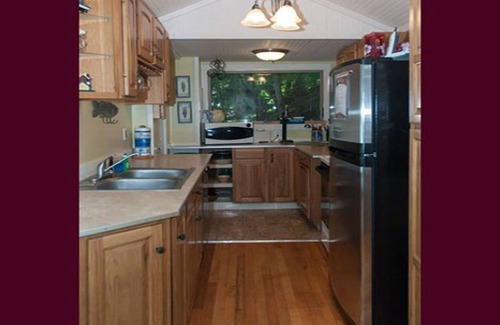 Lakeside comfort and charm greets you inside the cottage. Enter the dining area and immediately feel at ease. Open dining room/living room and kitchen is brightened by the natural light through the windows that span the entire front of the cottage. The living room features a gas stove for heat and ambiance, comfortable furniture, a flat screen TV and views of the lake. Off the living room are two bedrooms, one with a queen bed. The other a twin bed. And off one of the downstairs bedrooms is the stackable washer/dryer combination. Off the far end of the dining room you will enter another bedroom with a queen bed and all the amenities. Up one step off that bedroom is the front sunroom.
