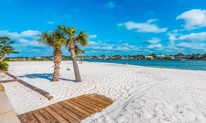 This townhouse is located in Banana Bay, a gated community of brightly colored homes with a private beach on the intracoastal waterway that's perfect for swimming and sunbathing. Also on the grounds are an outdoor pool, a hot tub, and a fitness center with a steam room and sauna. Just over a mile down the road, you'll find Perdido Key Beach and Johnson's Beach on the azure Gulf of Mexico.