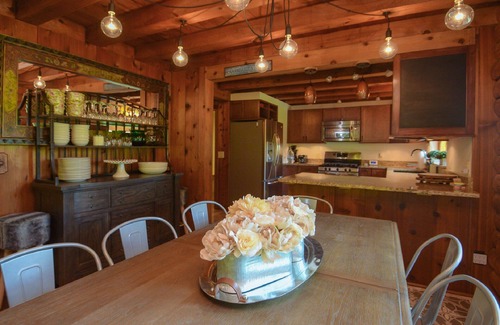 The cabin has a beautiful living/family room with gas fireplace and a great kitchen and dining room.