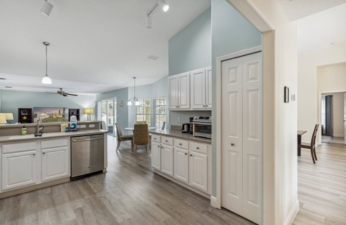 Step into a space where modern comforts and coastal designs converge, ensuring an unforgettable stay. The open layout offers each room tons of natural light, facilitating seamless transitions. Our fully-equipped kitchen featuring stainless steel appliances, contemporary cookware, and a convenient dishwasher allows for you to cook your favorite meals every night. The dining table serves more purpose than hosting a meal; it's perfect for the whole family to have a game night! Unwind in the living room with two reclining sofas, streaming your favorite movies on the TV.