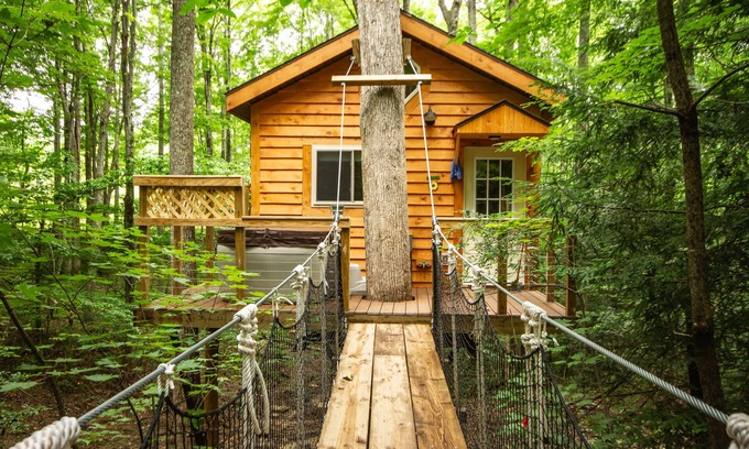 The Tuscany tree house can accommodate up to 4 adults with a private queen bedroom and queen sleeper sofa. It also includes expansive windows, a full bathroom with hot shower, large screen TV, queen bed, all linens and kitchenette facilities. Anchored 20 feet up in the air, the Tuscany tree house has both a front and back deck area to take in the beautiful views of the surrounding forest, with private hot tub on the front deck!
