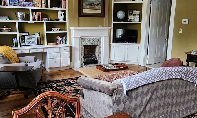 This is a one bedroom, one bath apartment with a pull out sofa bed. It has a fully stocked kitchen, washer and dryer, king sized bed and a private rooftop patio. Located in beautiful downtown Midway just steps from dining and boutique shopping, along with an active railway going right through town. Midway is in the center of horse country and the bourbon trail, with easy driving to numerous distilleries, horse farms, the Kentucky Horse Park and Keenland Race track. We are a 15 minute drive to both Lexington and Frankfort and a 10 minute drive to both Versailles and Georgetown, making it the perfect location to stay for Central Kentucky.