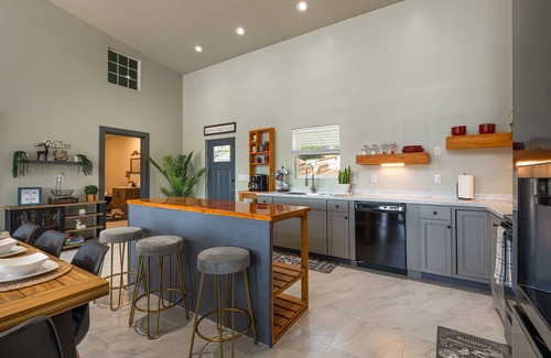 Kitchen that is fully stocked and open to the living room. Appliances include waffle maker, coffee maker, popcorn machine, slow cooker, toaster, blender, pots/pans & baking dishes.