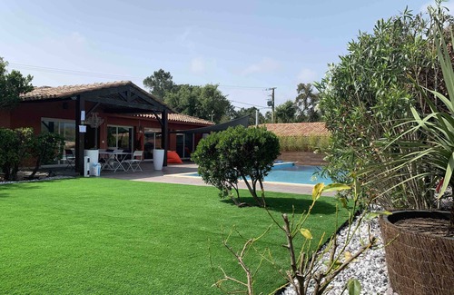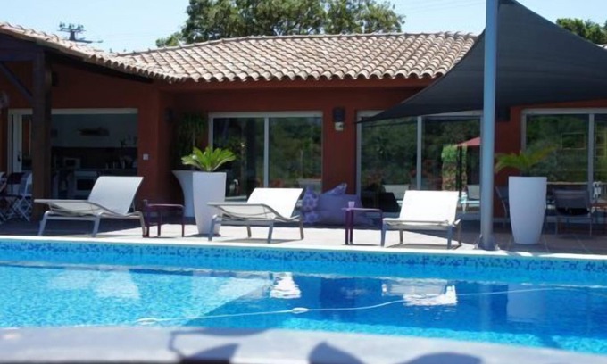 New 130 m² all mod cons detached villa, with 3 bedrooms, two bathrooms, large private pool (12 x 7), parking inside the property, private garden. In a quiet district, with a stunning view over the mountain, only 300 m from the sea (car not necessary). Carefully decorated, nice and modern. There is a functional fully equipped kitchen. Single storey villa with large bay windows opening onto the terrace and the pool. Suitable for disabled people.
