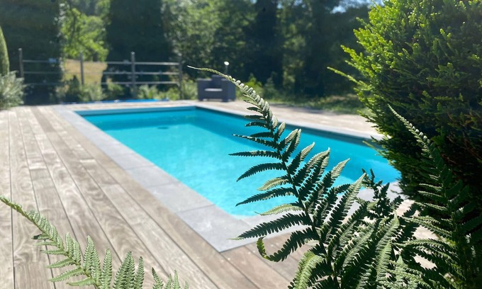 The 3m by 7m swimming pool is unheated and equipped with a removable safety cover.