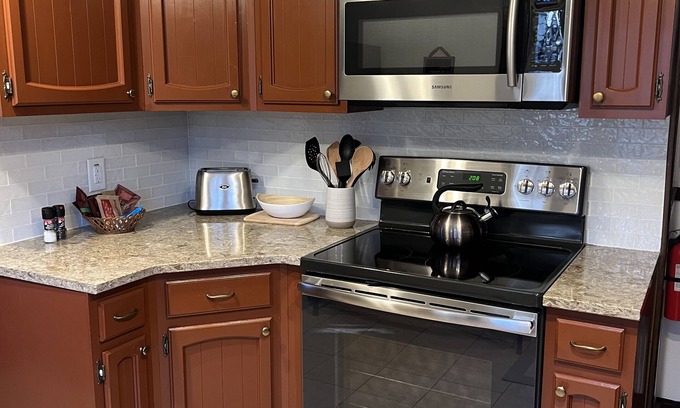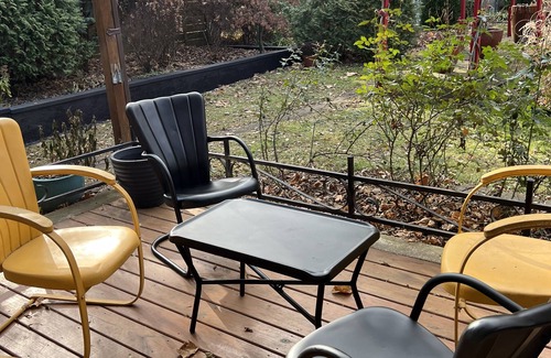 Tasteful new furnishings throughout, including comfortable new mattresses and bedding. Kitchen includes quartz counter tops and all new stainless steel appliances. Updated bathroom with brand new tile shower and glass doors. Classic elements and exquisite detailing include: hardwood flooring and trim, built-in buffet, china cabinet and bookcases. Central air and heat. Washer and dryer. Relax with a glass of good wine on the covered deck overlooking private gardens with walkways, koi pond and Chimenea fire place. Great for any visit to Purdue or West Lafayette. People of all backgrounds are warmly welcomed to stay at our guest house.