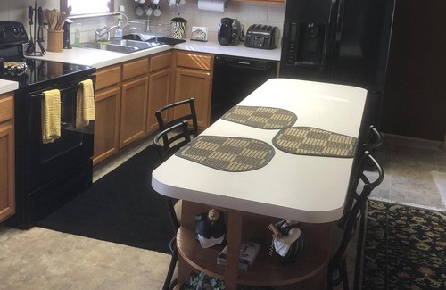 A fully equipped kitchen with four burner stove and oven, microwave, coffee maker both Keurig and drip, blender, toaster, plus all necessary cookware, dishes and flatware.