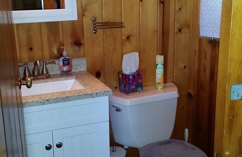 Half bathroom located directly off kitchen with a separate dedicated shower room accessible from side porch.