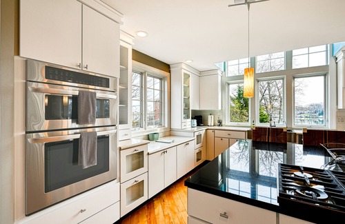 Spend sparkling summer days outdoors, where several beautiful spaces await you. Sip your first cup of morning coffee in an Adirondack chair on the deck, taking in a serene view of the bay below. Launch your kayak from the dock, watch your kids play in the gently sloped backyard, and gather for evening barbecues on the shaded patio beneath the deck. One of the guest bedrooms boasts direct patio access.