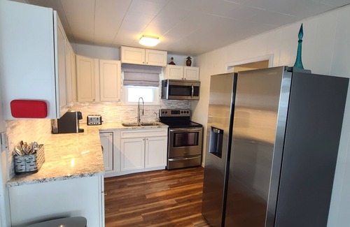 The property has chain link fence both front and back. We also have 2 washer and dryer's, one on main level and one on lower level for your convenience. There is also 2 full bathrooms, one on main level and one on lower level. The lower level is a continuous space that acts as a 2nd living room and at night offers extra sleeping areas. One queen size cabinet bed, one queens size sofa bed and a full bed on a platform.
